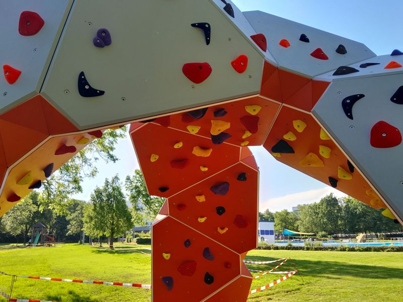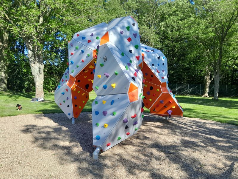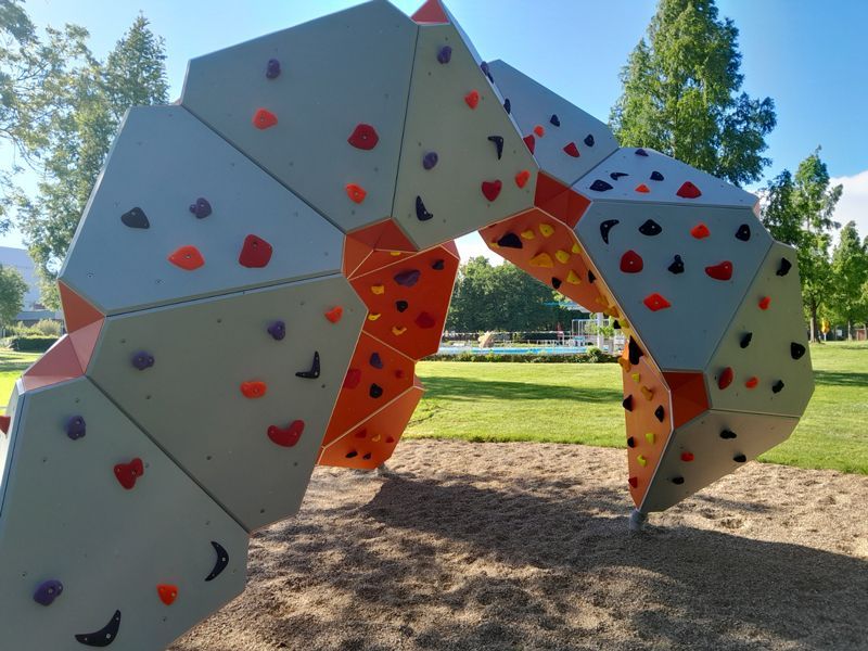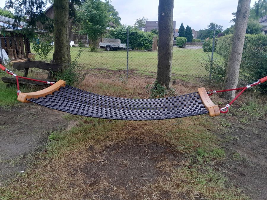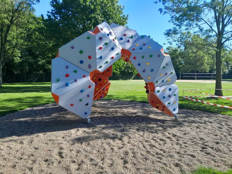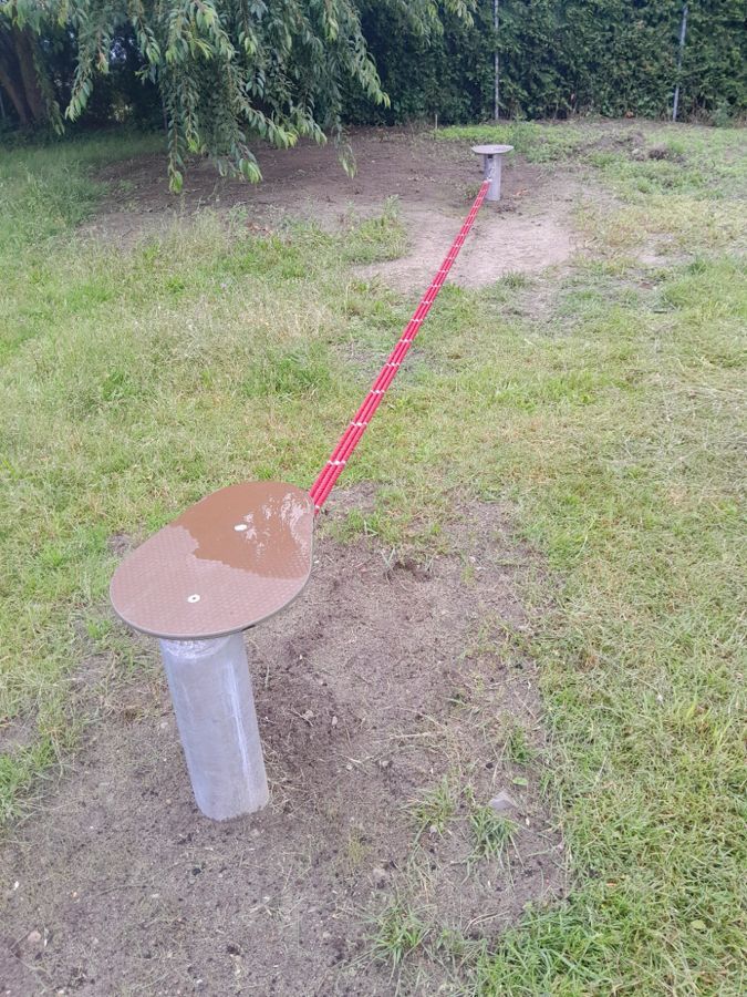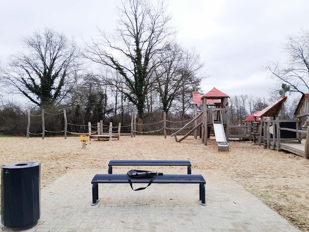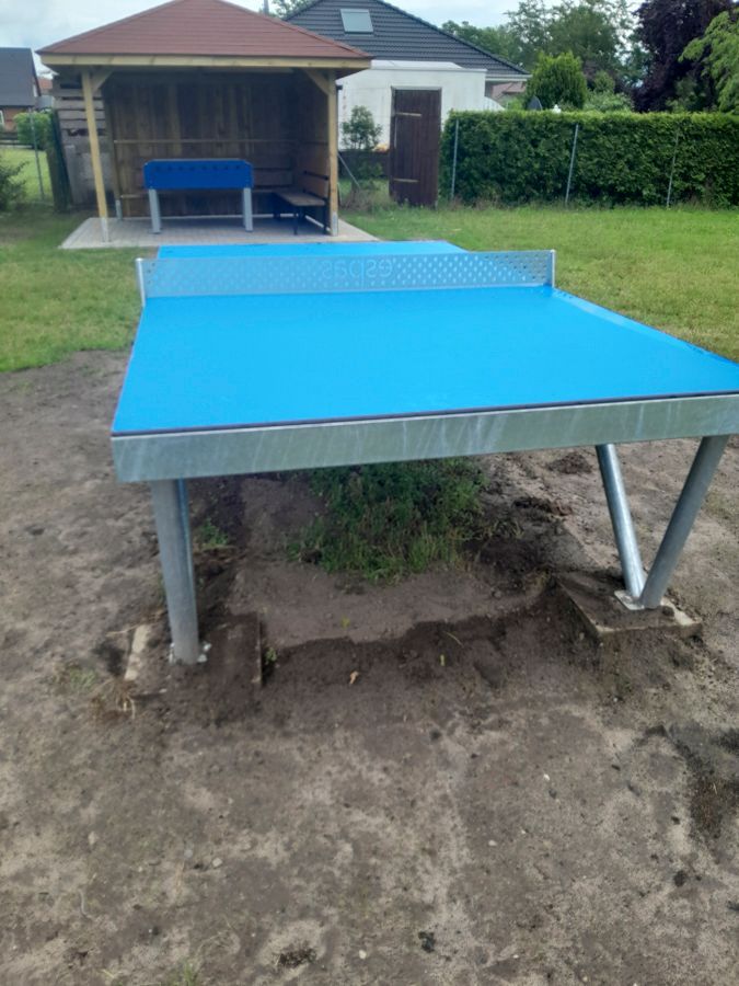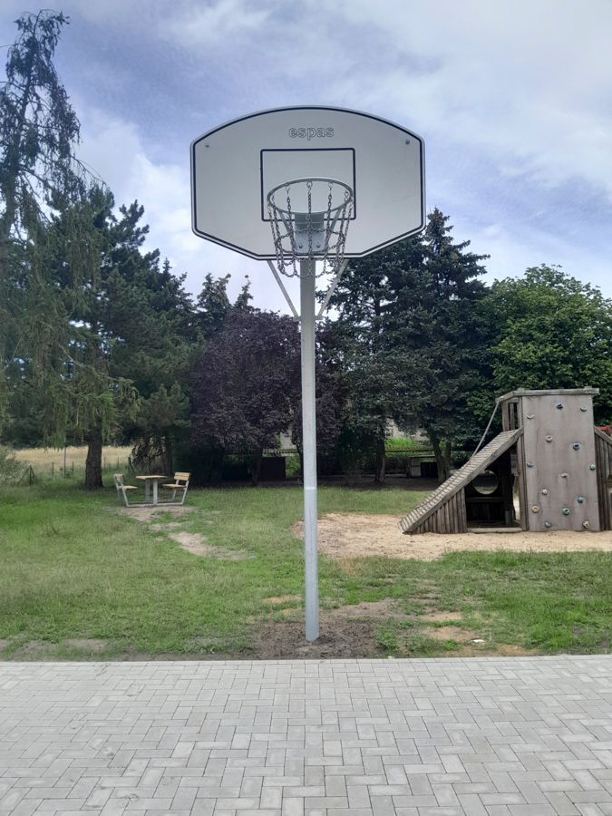 Hier wurde der Spielplatz um einige Sportgeräte für Jugendliche erweitert. Dort findet sich jetzt ein Basketballfeld, eine Tischtennisplatte, eine Slagline und ein Kickertisch. Abgerundet wird das Angebot mit Bänken, Liegen und einer Hängematte.